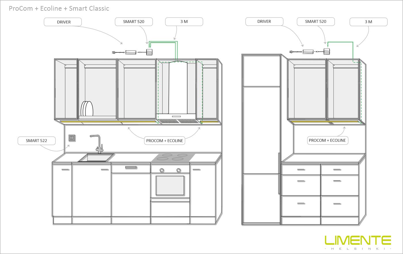 LIMENTE PRO LED-strip is dimmable either with LIMENTE SMART CLASSIC, LUXUS ja GREENLINE series 24V dimmer (no. 640540) and wireless wall switches (no. 640541, 640542, 640543, 640544, 640546 and 640547). The dimmer is installed between the power supply and the fixture. The dimmer includes a similar manifold to the one included in the power supply. You can connect up to 6 LIMENTE lights to one dimmer, as long as the maximum load (W) of the power supply is not exceeded.