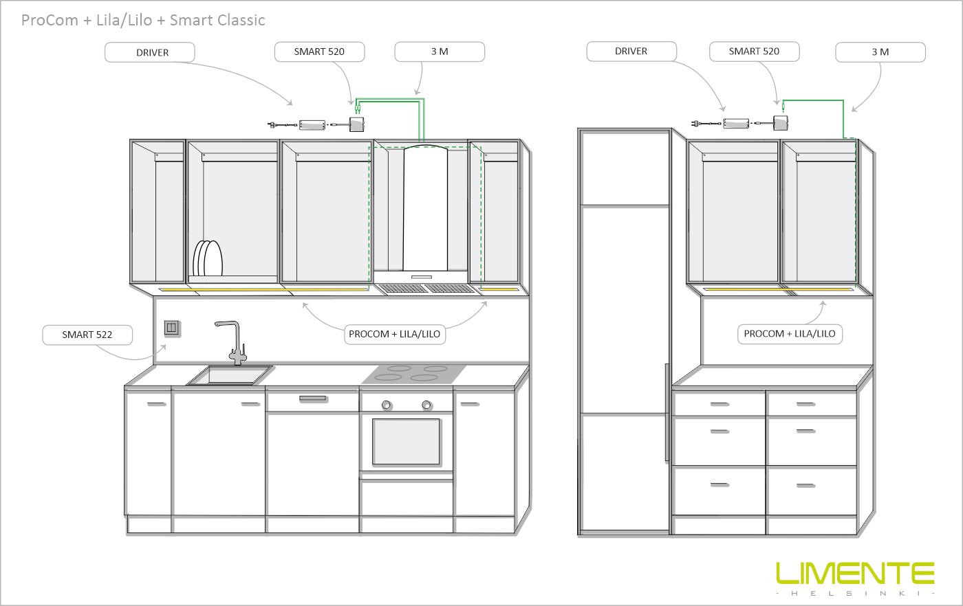 LIMENTE PROCOM LED strips can be shortened at intervals of approximately 6 cm. Both ends of the LED strips feature a power feed, allowing you to utilize both ends separately if needed. PRO-series LED strips must always be attached to a heat-conductive material, such as the LED lighting profile available as an accessory. This ensures the promised lifespan of the LED strip. The profile also enables installation under a dish-drying rack, for example, and its matte cover (diffuser) makes the light more uniform. In all cases, ensure that the mounting surface is absolutely clean and dry before attaching the LED strip.