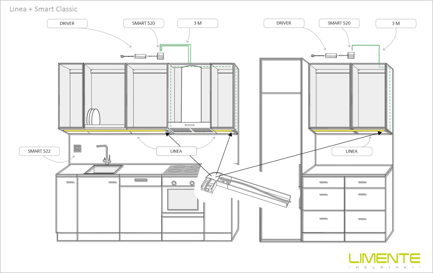 LIMENTE LINEA DOB is a versatile light fixture suitable for either working light or mood light. The new DOB technology provides a completely dot-free light, which can be used in a profile even without a diffuser if desired. The fixture can be used in kitchen workspace but also to provide indirect lighting when placed above upper cabinets, in plinths, in ceilings or inside a wardrobe or any other space, where light is needed. See ”Installation pictures” for tips on how to use LINEA as working lighting in a kitchen workspace but also as indirect lighting when placed above upper cabinets or inside a wardrobe. In kitchen workspaces the fixture is installed near the front edge of the kitchen upper cabinet. LIMENTE LINEA DOB luminaires are available in two color temperatures (3000 K and 4000 K) and three colors (aluminum, black, and white). The length of the aluminum profile is always 2 m and it can be shortened to size.