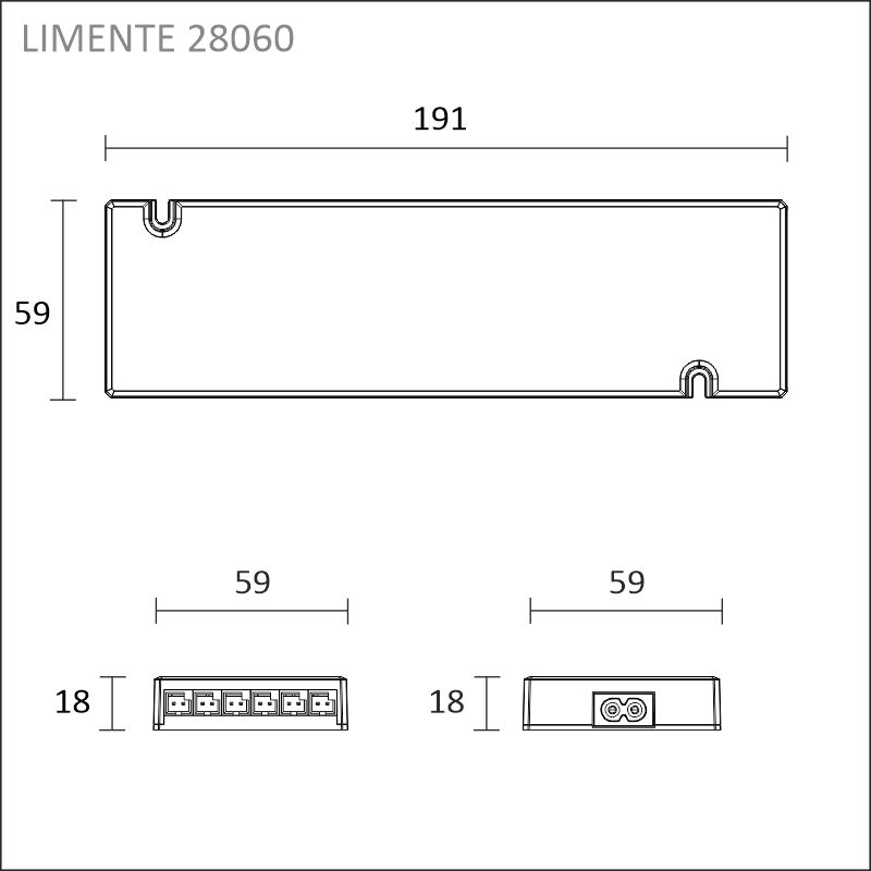The dimmer is installed between the power supply and the fixture. The dimmer includes a similar manifold to the one included in the power supply. You can connect up to 6 LIMENTE lights to one dimmer, as long as the maximum load (W) of the power supply is not exceeded.