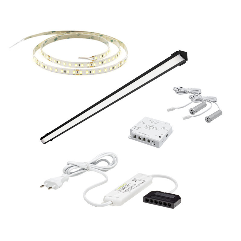 LIMENTE aamiaiskaappisetti on monipuolinen ratkaisu, joka sisältää kaiken tarvittavan aamiaiskaapin varustamiseen. Setti on täydellinen sisältäen pystyyn tai vaakaan asennettavan valoprofiilin, virtalähteen ja tunnistimen, joka sytyttää valot, kun kaapin oven avaa.