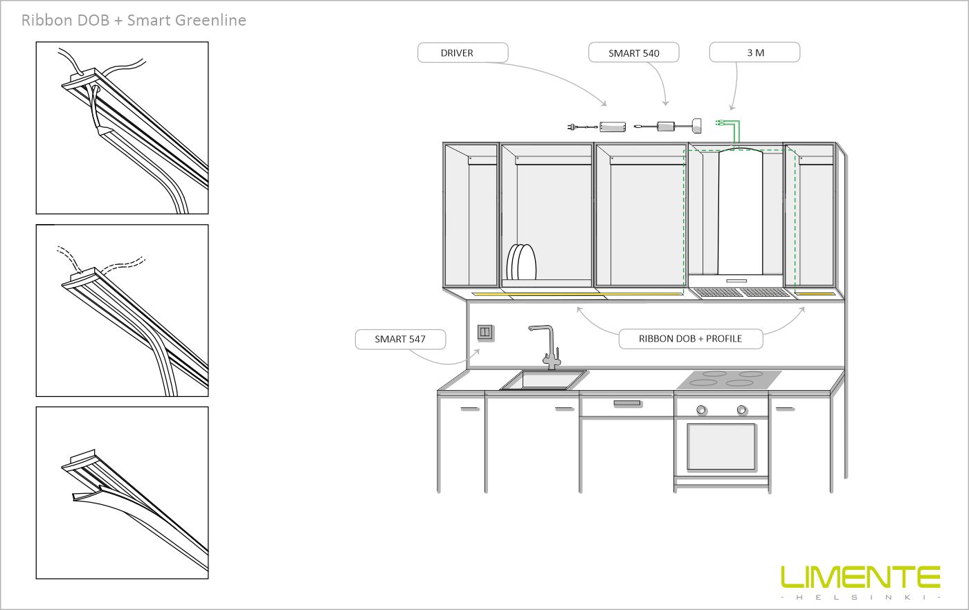LIMENTE DOB-COM IP44-nauhan asennus on nopea ja helppo suorittaa. Virransyöttöjohto, joka usein piilotetaan esim. kaapin taakse, laitetaan valmiiksi paikoilleen siten, että urospää tulee lähelle virtalähdettä ja naaras lähelle RIBBON DOB -valonauhaa. Valonauhasta poistetaan teipin suojakalvo ja nauha painetaan asennuspaikkaan. Lopuksi virransyöttöjohto kytketään kiinni valonauhaan sekä virtalähteeseen pikaliittimillä.