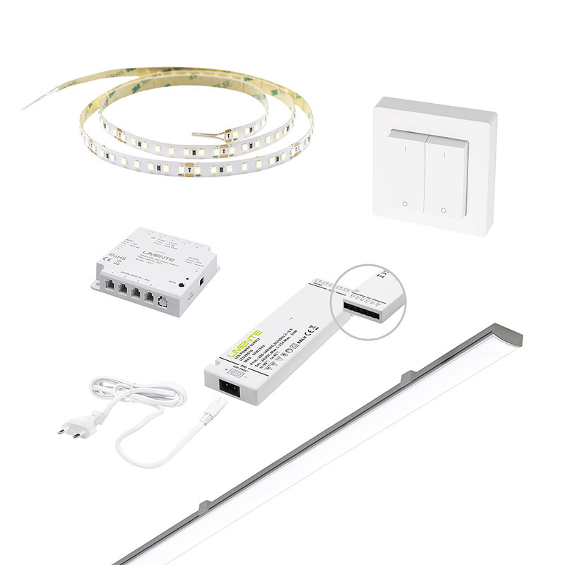 Välitilasetti toimitetaan täydellisenä niin, että profiilien ja LED-nauhan lisäksi myös virtalähde kuuluu toimitukseen. Voit myös valita välitilasetin, jossa himmennin ja langaton säädin kuuluu pakettiin.