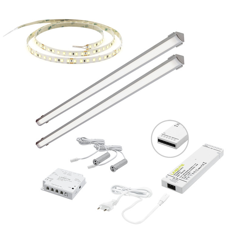 De 2 m långa ljusprofilerna som ingår i satsen kan kortas. Utöver profilen, innehåller armaturen ett mattytat skydd (diffuser) som gör ljuset prickfritt samt ändrar ljusets färgton till en aning varmare. Alla belysningsvärden är angivna till led-stripen / led-listen utan skydd.