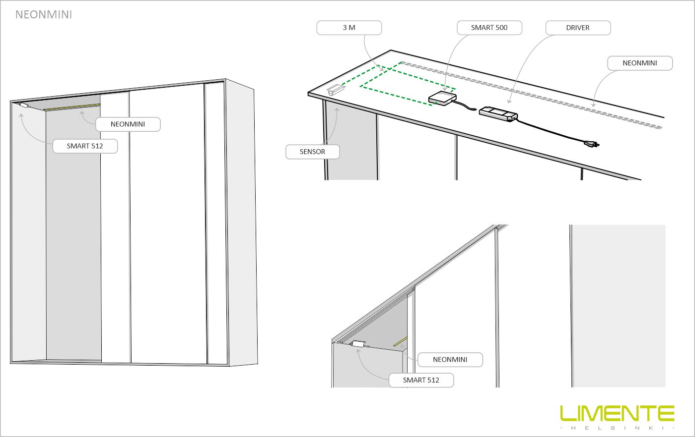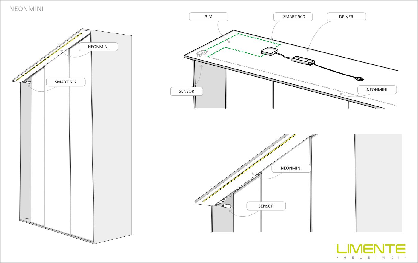 NeonMini-remsorna kan förkortas med 2 cm mellanrum. Det finns strömförsörjning i båda ändar av Neon-remsorna, vilket innebär att du vid behov kan utnyttja båda ändarna separat. NeonMini-remsor ska alltid fästas antingen i ett spår som gjorts i ytan eller i en Neon-profil som finns som tillbehör.