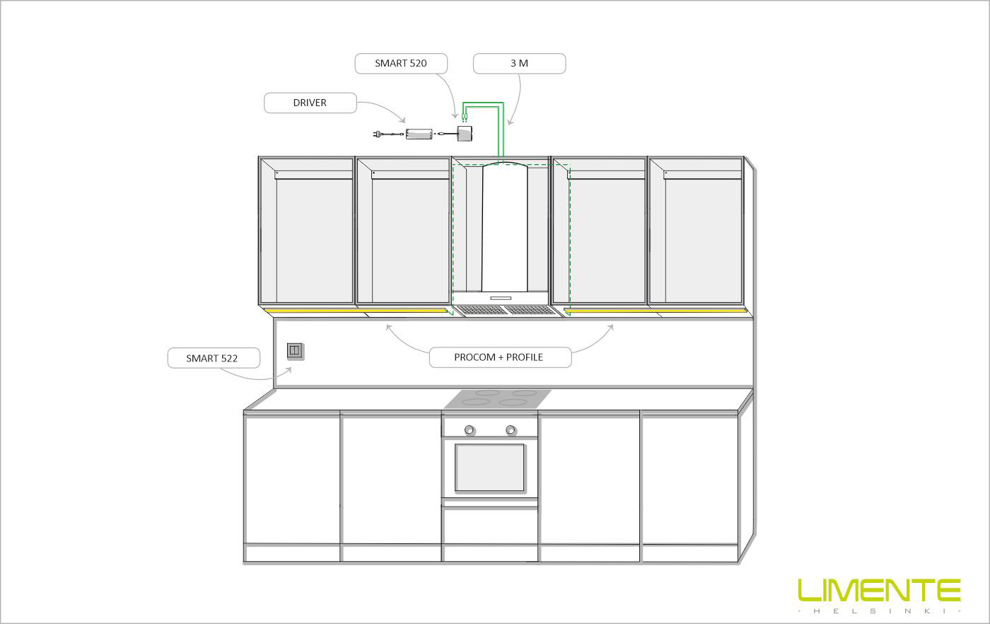LIMENTE arbetsbelysningssats är en mångsidig, förkortningsbar belysningslösning som kan användas för att skapa både arbets- och stämningsbelysning. Den passar utmärkt som indirekt belysning ovanpå skåp, i nischer, socklar, tak, med mera, utöver att den fungerar som bänkbelysning i köket. I köket placeras profilen nära framkanten av överskåpets botten.