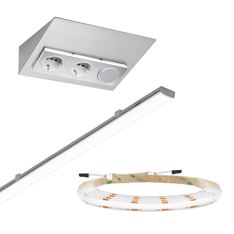 Köksutrymmeskittets armatur kan användas på båda sidor om uttaget samt förkortas mellan 0–200 cm så att den sammanlagda längden är max 200 cm. Kittet erbjuder ett effektivt och jämnt arbetsljus som styrs smidigt från uttaget utan ett separat ljusstyrsystem. Köksutrymmeskittet finns tillgängligt i två olika färgtemperaturer: 3000 K och 4000 K. Ljusstyrkan är 1300 lm/m, verkningsgraden 144 lm/W och dioderna sitter mycket tätt (288 led/meter).